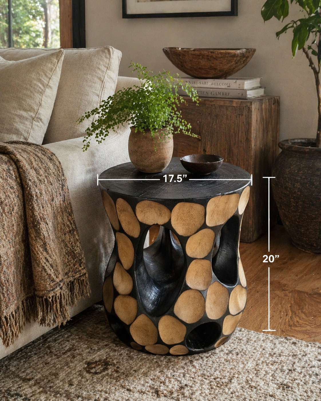 Bring warmth and sculptural beauty into your space with this handcrafted one-of-a-kind mango wood side table. Featuring a bold organic design with a rich black finish and natural wood accents, this piece blends modern elegance with natural artistry. Perfect as a side table, accent table, or statement décor piece for any living room, bedroom, or lounge.