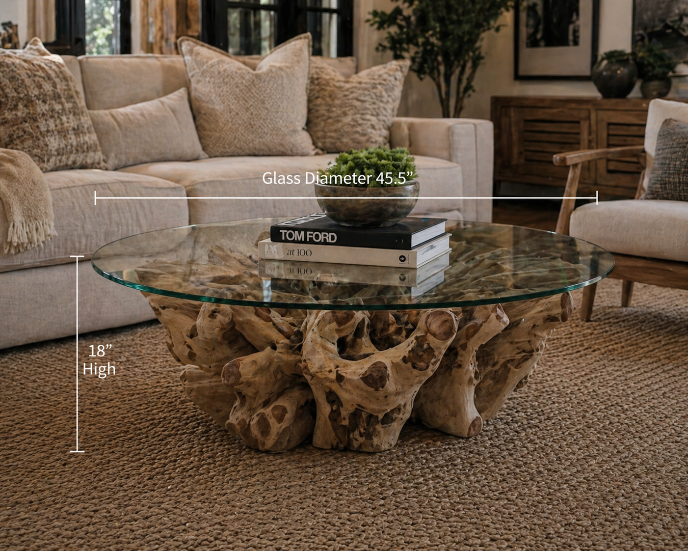 Crafted from natural teak root, this stunning coffee table is a true statement piece. Each curve and texture is shaped by nature, making every table completely unique—no two are ever the same. The organic form of the root base is beautifully complemented by a clear glass top, creating a perfect balance between raw nature and modern design.